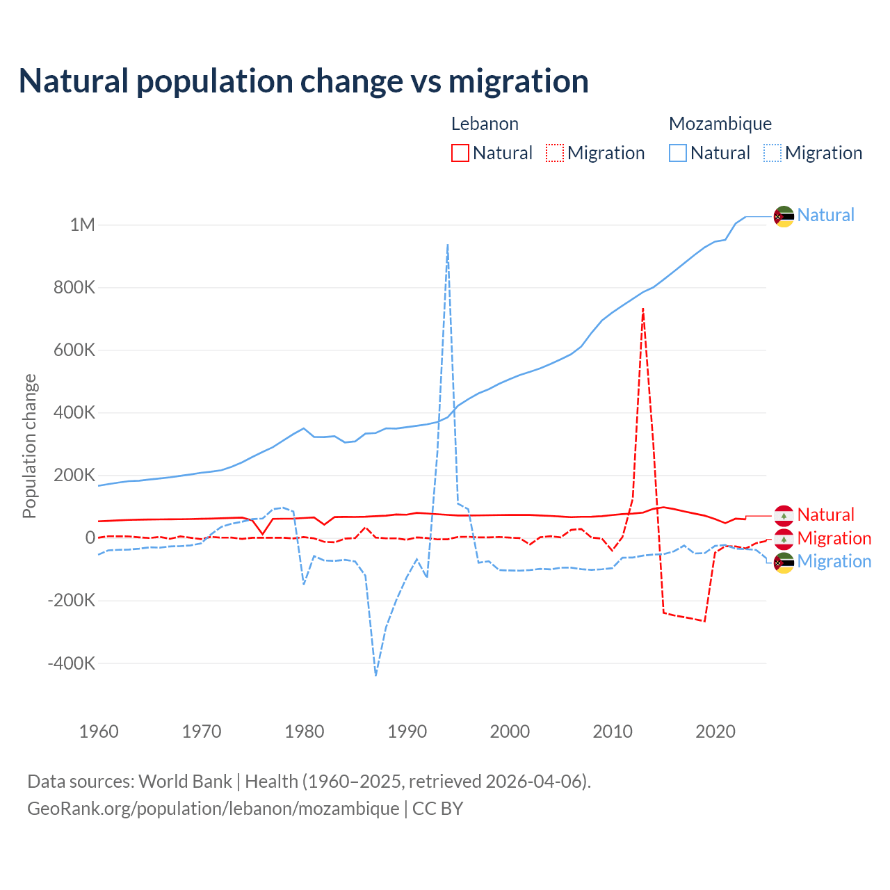 Over the last 10 years, 40.1% of the population change in Lebanon is from natural causes (a gain of 739,256 people) and 59.9% is from migration (a loss of 1,103,772 people). In Mozambique 95.9% is from natural causes (a gain of 9,108,203 people) and 4.15% is from migration (a loss of 393,923 people).