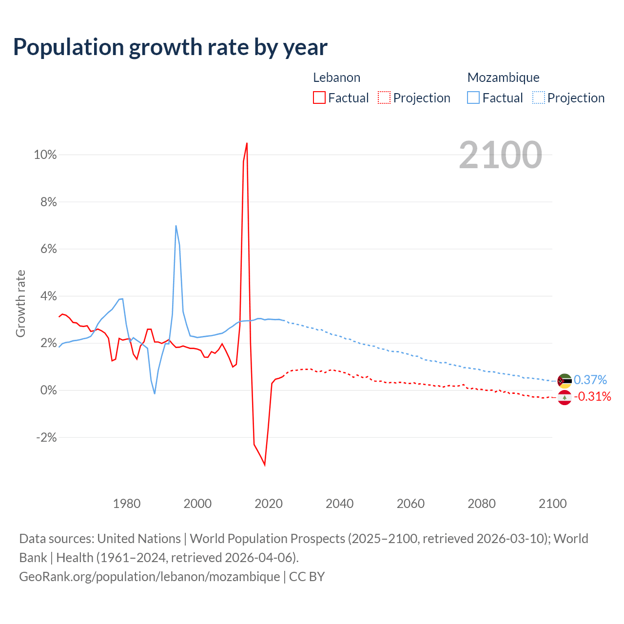- For the last 10 years, Lebanon has had an average growth rate of +0.16% per year vs +2.99% in Mozambique.