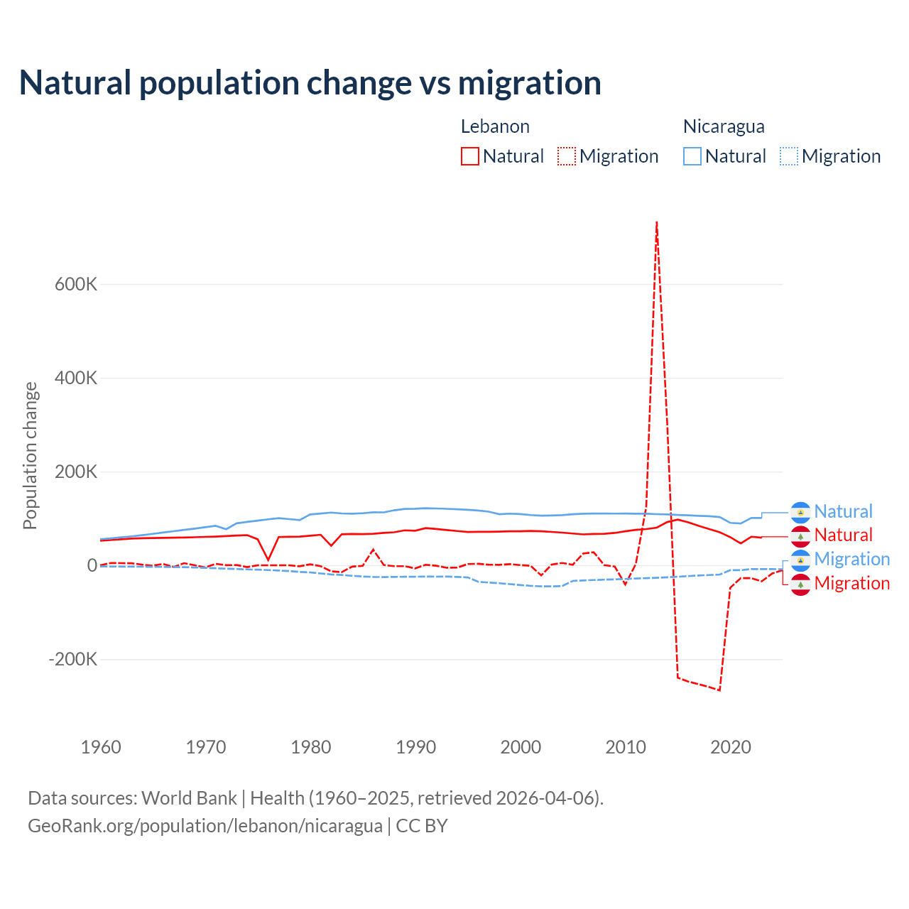 Over the last 10 years, 40.1% of the population change in Lebanon is from natural causes (a gain of 739,256 people) and 59.9% is from migration (a loss of 1,103,772 people). In Nicaragua 85.5% is from natural causes (a gain of 1,017,084 people) and 14.5% is from migration (a loss of 172,078 people).