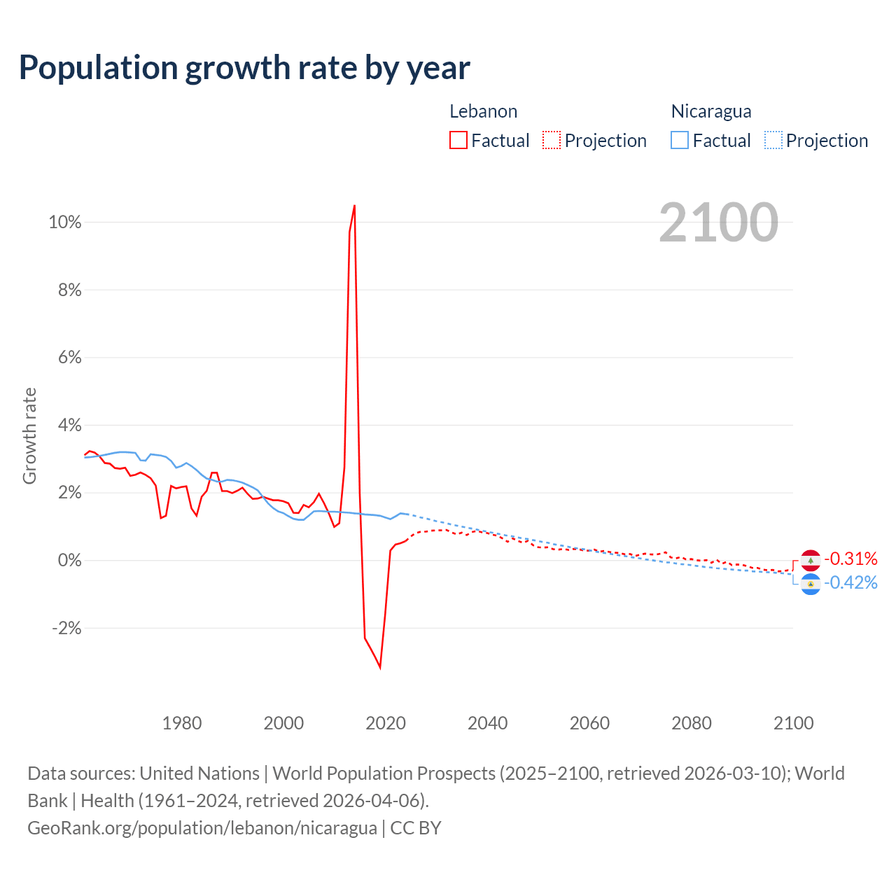 - For the last 10 years, Lebanon has had an average growth rate of +0.16% per year vs +1.33% in Nicaragua.