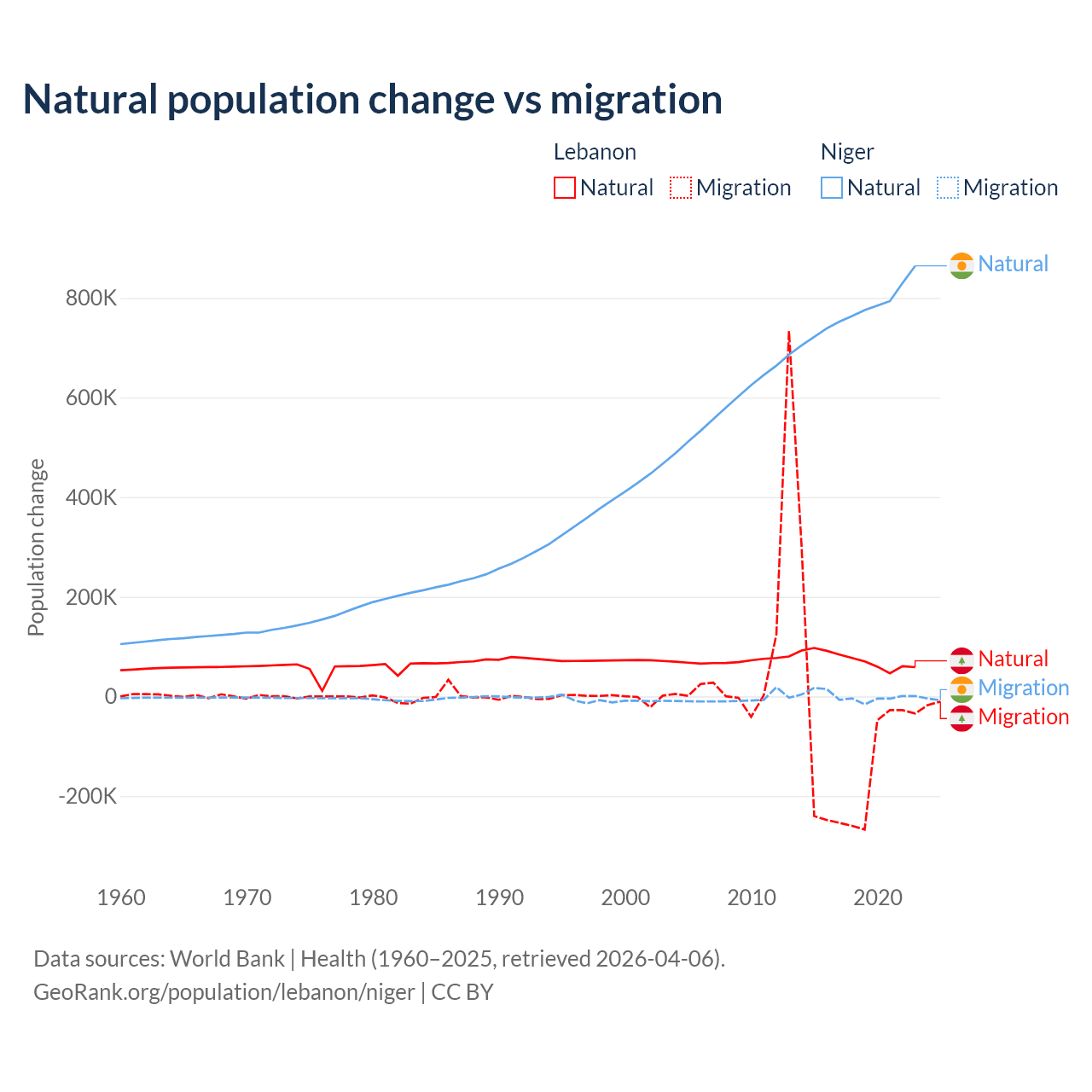 Over the last 10 years, 40.1% of the population change in Lebanon is from natural causes (a gain of 739,256 people) and 59.9% is from migration (a loss of 1,103,772 people). In Niger 100% is from natural causes (a gain of 7,728,287 people) and 0.03% is from migration (a gain of 2,520 people).