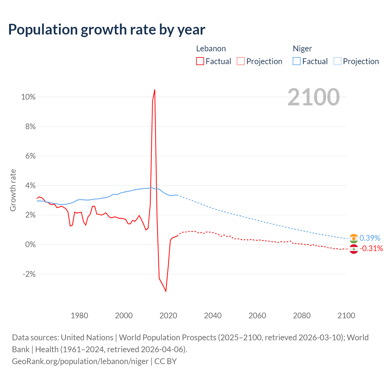 - For the last 10 years, Lebanon has had an average growth rate of +0.16% per year vs +3.5% in Niger.