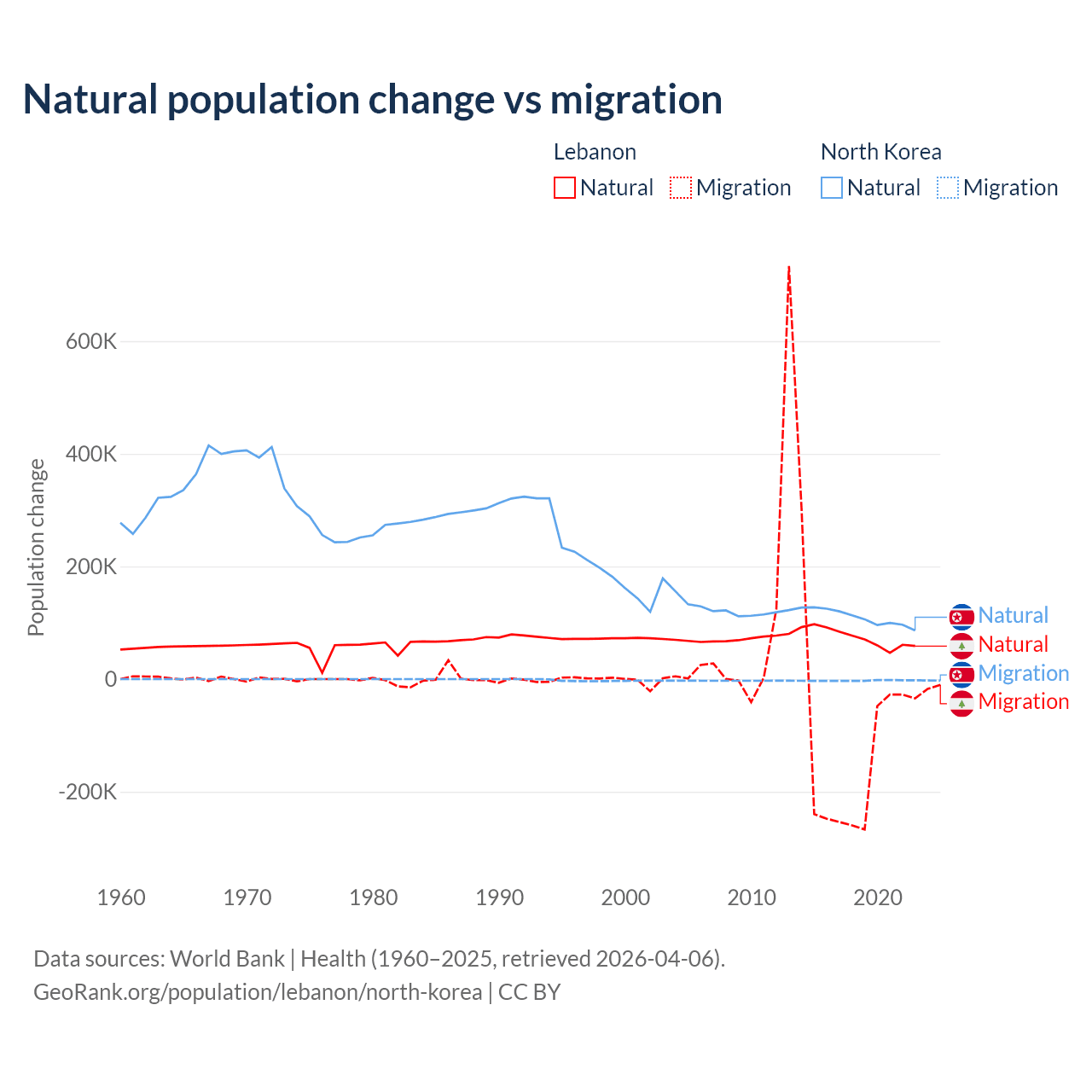 Over the last 10 years, 40.1% of the population change in Lebanon is from natural causes (a gain of 739,256 people) and 59.9% is from migration (a loss of 1,103,772 people). In North Korea 97.7% is from natural causes (a gain of 1,097,372 people) and 2.33% is from migration (a loss of 26,227 people).