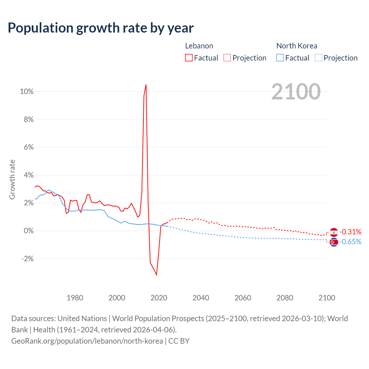 - For the last 10 years, Lebanon has had an average growth rate of +0.16% per year vs +0.41% in North Korea.