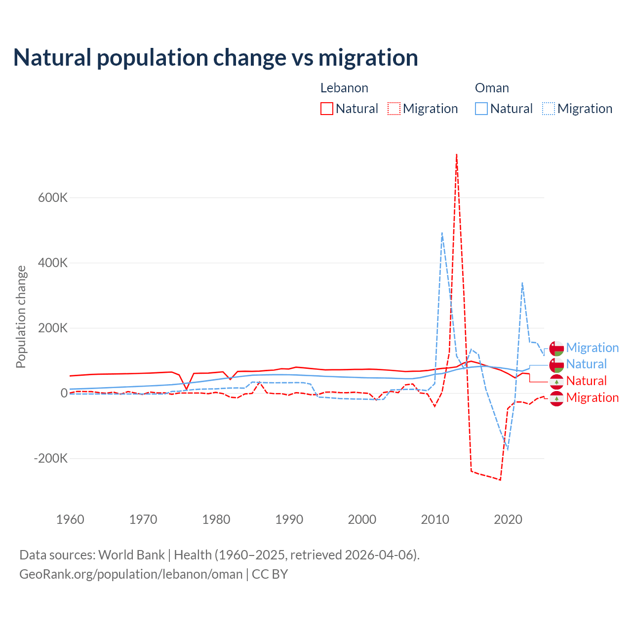 Over the last 10 years, 40.1% of the population change in Lebanon is from natural causes (a gain of 739,256 people) and 59.9% is from migration (a loss of 1,103,772 people). In Oman 61.6% is from natural causes (a gain of 763,049 people) and 38.4% is from migration (a gain of 475,565 people).