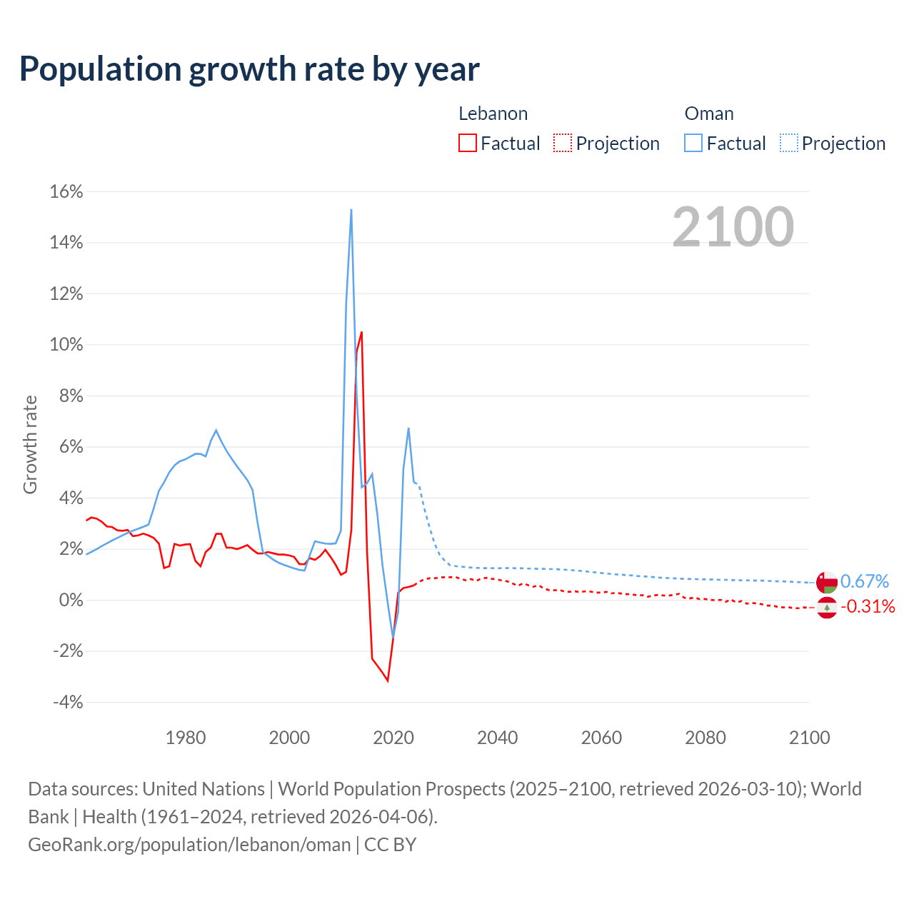 - For the last 10 years, Lebanon has had an average growth rate of +0.16% per year vs +2.99% in Oman.