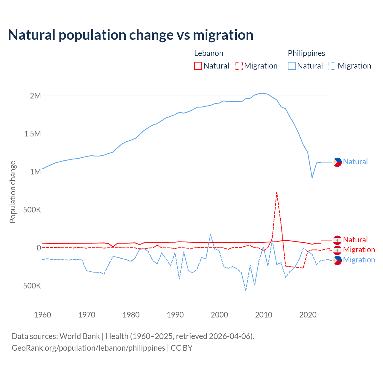 Over the last 10 years, 40.1% of the population change in Lebanon is from natural causes (a gain of 739,256 people) and 59.9% is from migration (a loss of 1,103,772 people). In the Philippines 88.5% is from natural causes (a gain of 14,279,705 people) and 11.5% is from migration (a loss of 1,848,117 people).