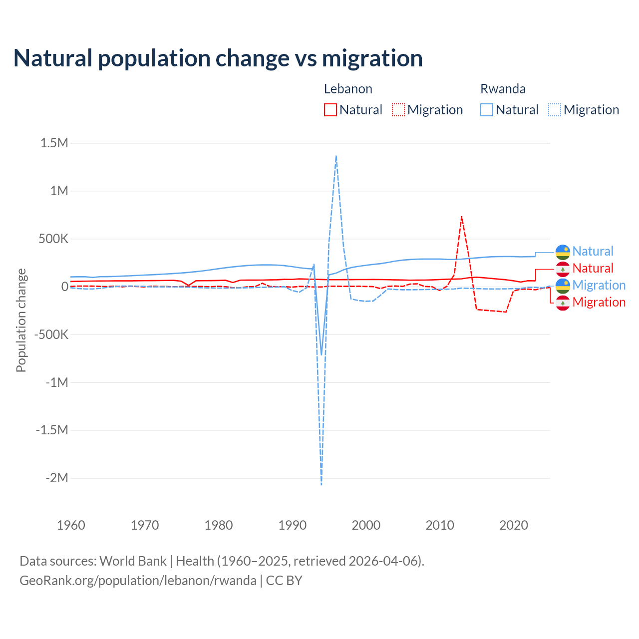 Over the last 10 years, 40.1% of the population change in Lebanon is from natural causes (a gain of 739,256 people) and 59.9% is from migration (a loss of 1,103,772 people). In Rwanda 93.8% is from natural causes (a gain of 3,081,296 people) and 6.18% is from migration (a loss of 203,035 people).