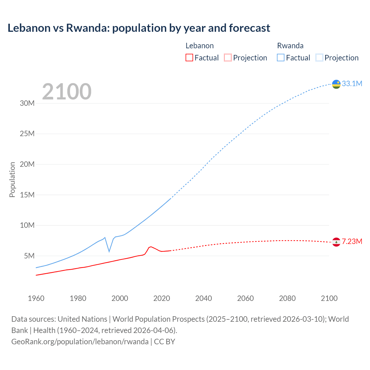 Lebanon vs Rwanda: population by year and forecast