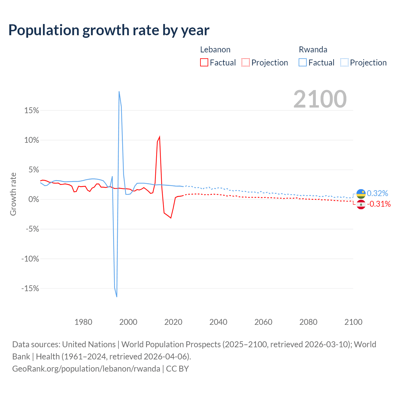 - For the last 10 years, Lebanon has had an average growth rate of +0.16% per year vs +2.31% in Rwanda.
