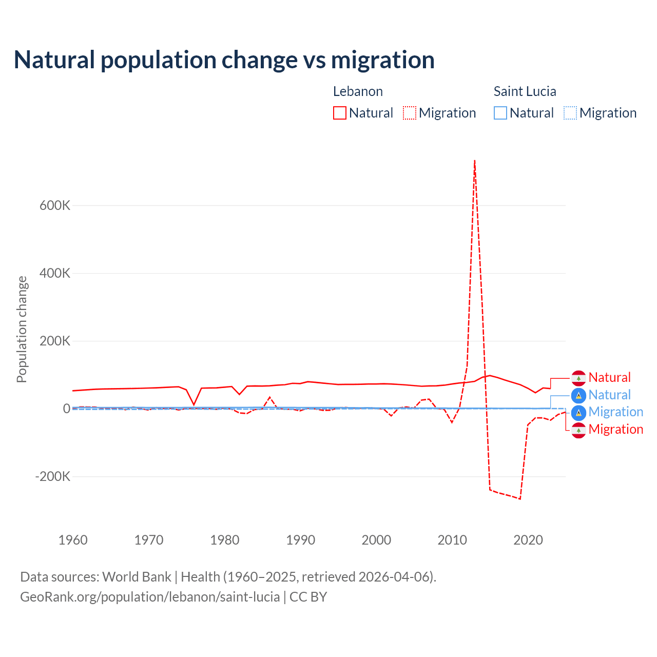 Over the last 10 years, 40.1% of the population change in Lebanon is from natural causes (a gain of 739,256 people) and 59.9% is from migration (a loss of 1,103,772 people). In Saint Lucia 95.7% is from natural causes (a gain of 6,039 people) and 4.31% is from migration (a loss of 272 people).