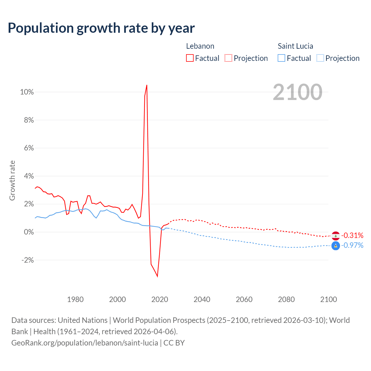 - For the last 10 years, Lebanon has had an average growth rate of +0.16% per year vs +0.33% in Saint Lucia.