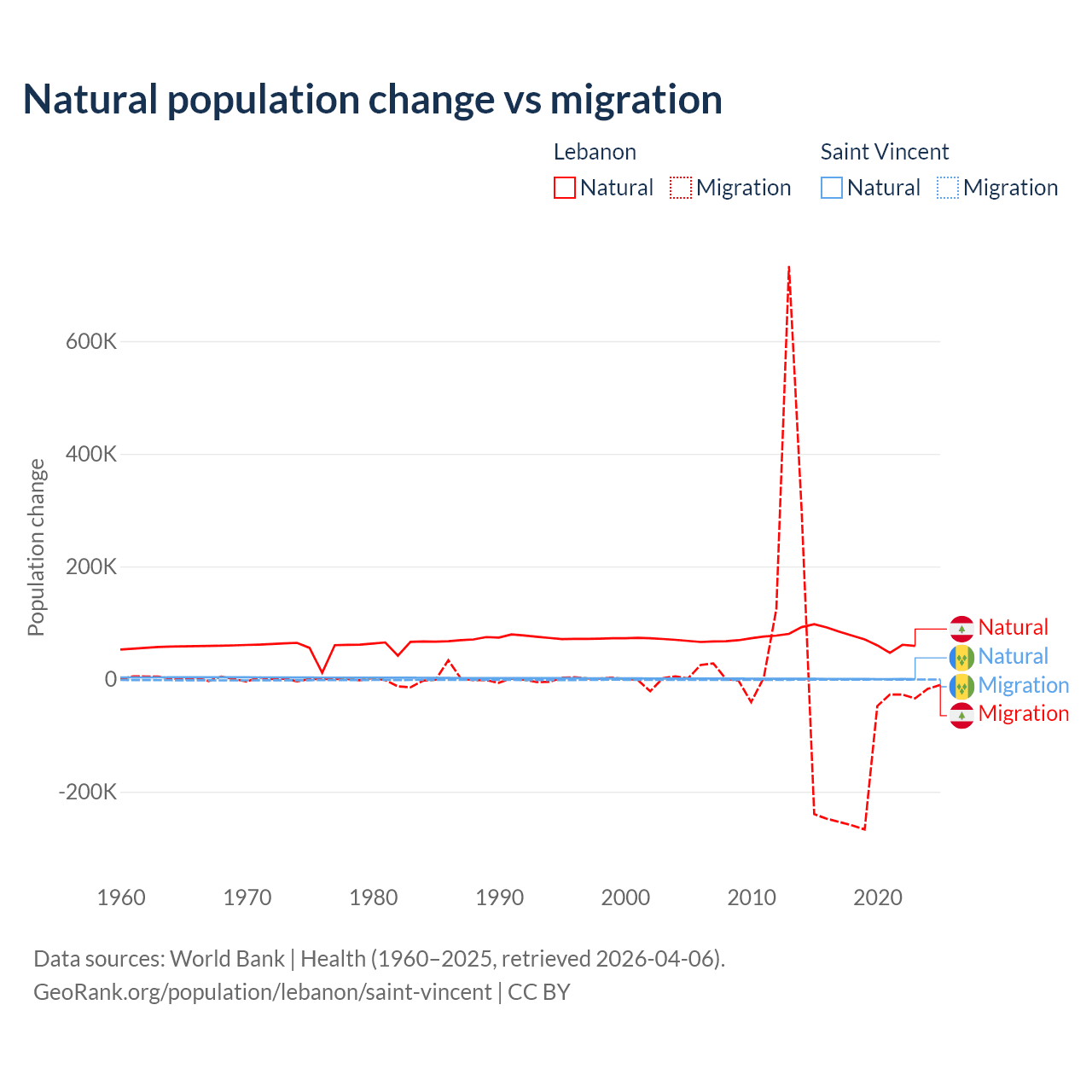 Over the last 10 years, 40.1% of the population change in Lebanon is from natural causes (a gain of 739,256 people) and 59.9% is from migration (a loss of 1,103,772 people). In Saint Vincent 21.2% is from natural causes (a gain of 2,525 people) and 78.8% is from migration (a loss of 9,393 people).