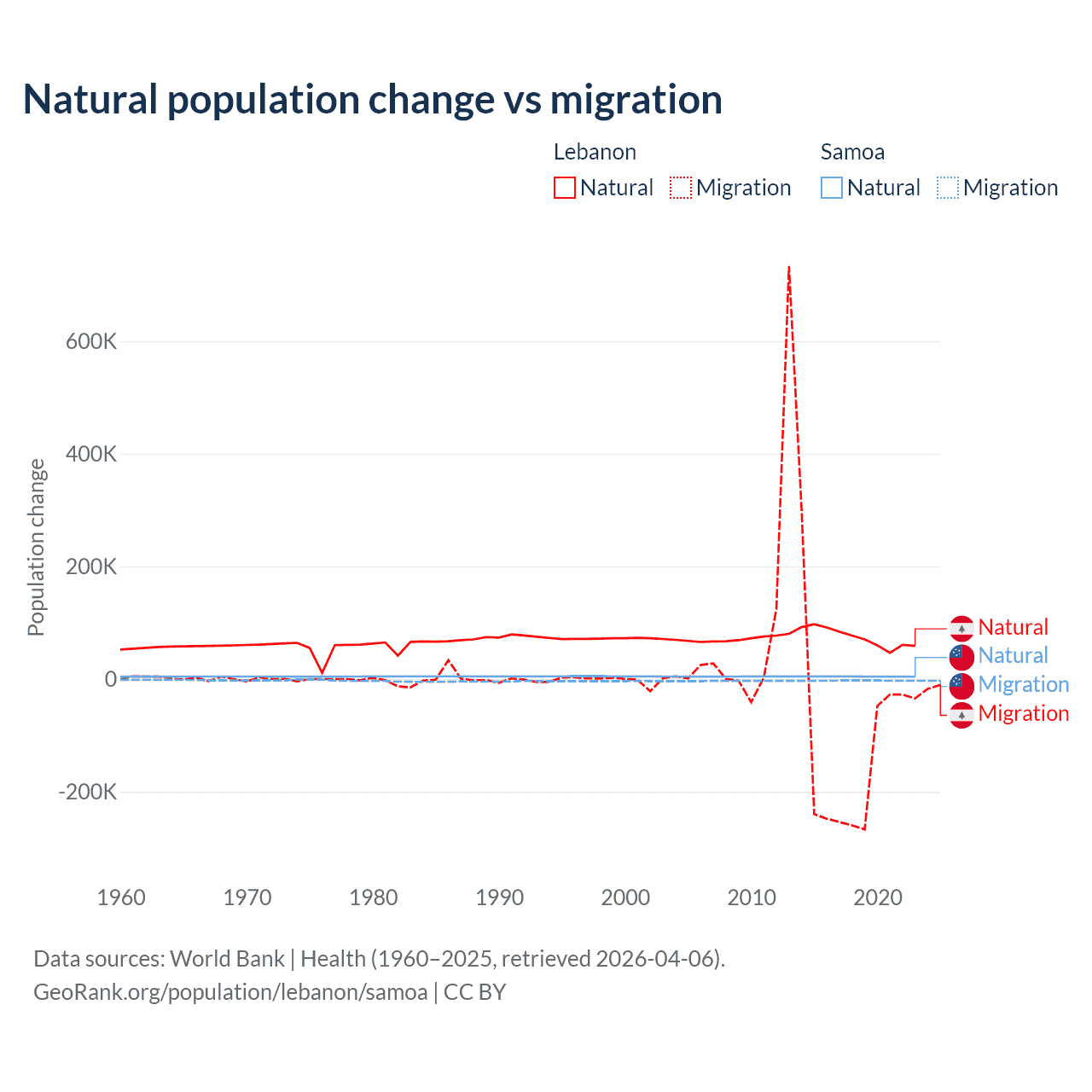 Over the last 10 years, 40.1% of the population change in Lebanon is from natural causes (a gain of 739,256 people) and 59.9% is from migration (a loss of 1,103,772 people). In Samoa 62.5% is from natural causes (a gain of 45,436 people) and 37.5% is from migration (a loss of 27,246 people).