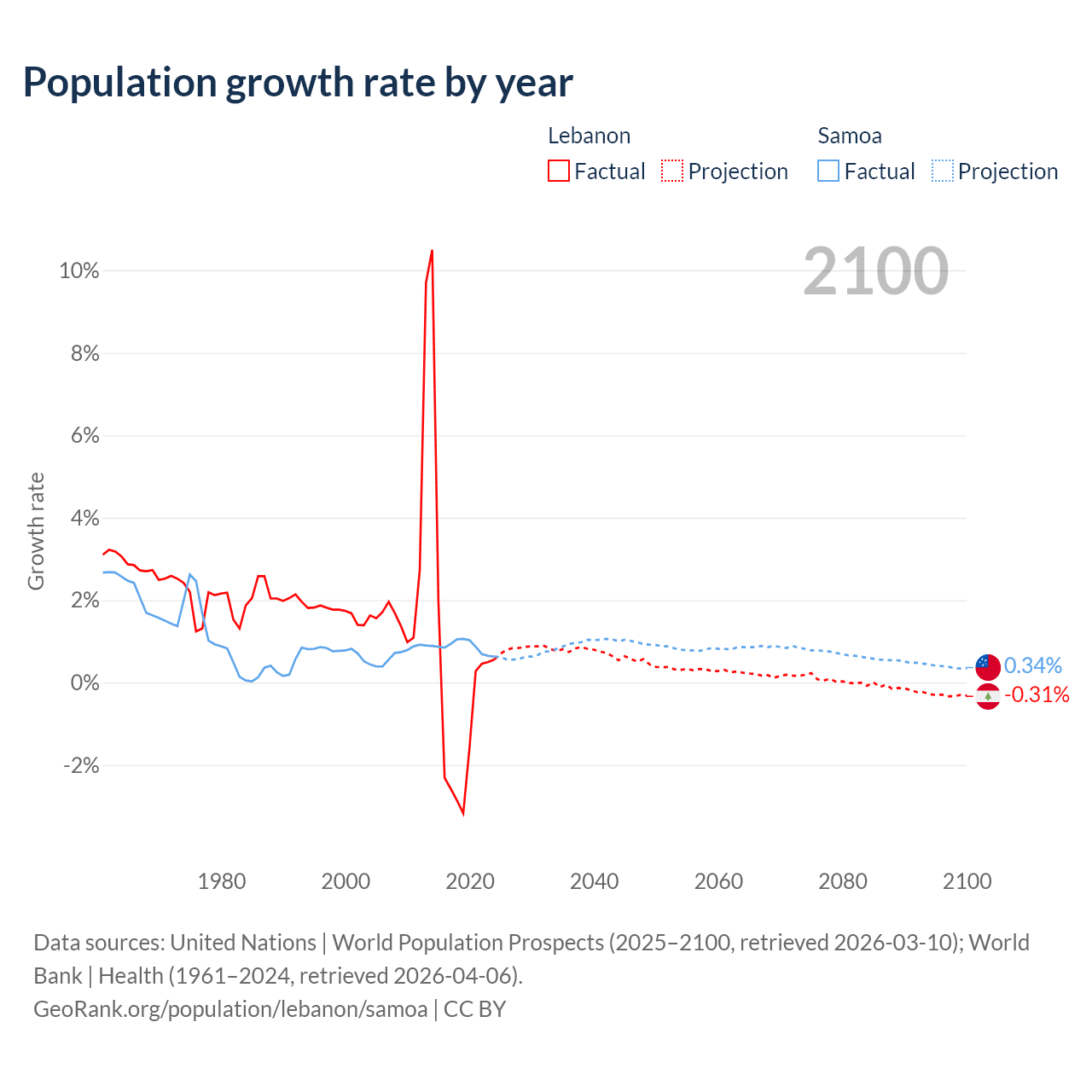 - For the last 10 years, Lebanon has had an average growth rate of +0.16% per year vs +0.87% in Samoa.