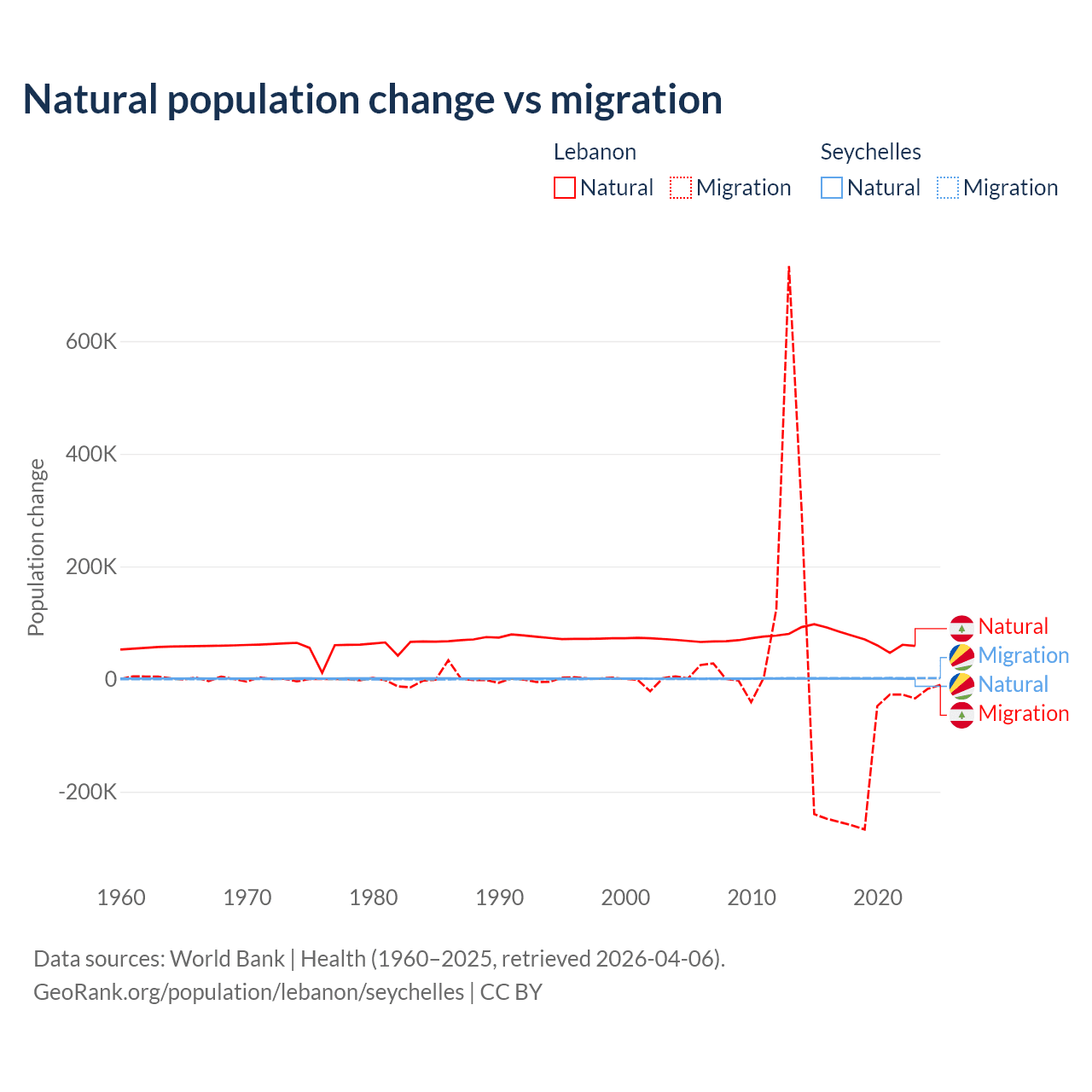 Over the last 10 years, 40.1% of the population change in Lebanon is from natural causes (a gain of 739,256 people) and 59.9% is from migration (a loss of 1,103,772 people). In the Seychelles 31.4% is from natural causes (a gain of 8,122 people) and 68.6% is from migration (a gain of 17,748 people).