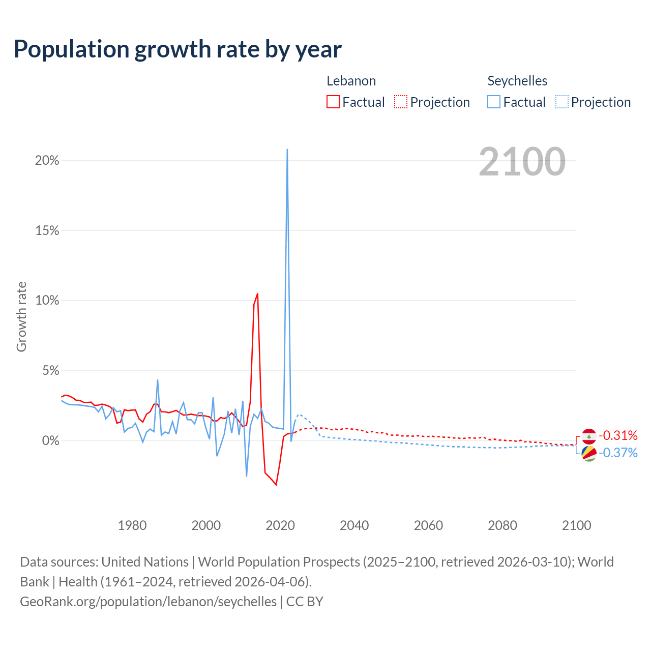 - For the last 10 years, Lebanon has had an average growth rate of +0.16% per year vs +2.9% in the Seychelles.