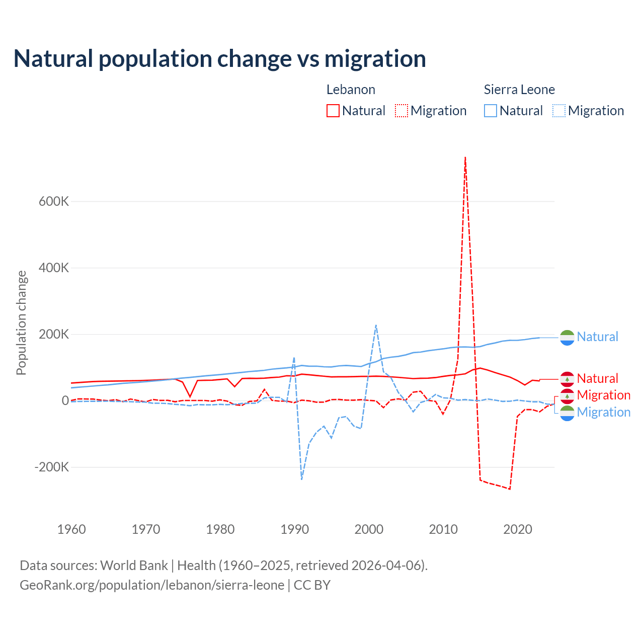Over the last 10 years, 40.1% of the population change in Lebanon is from natural causes (a gain of 739,256 people) and 59.9% is from migration (a loss of 1,103,772 people). In Sierra Leone 99.6% is from natural causes (a gain of 1,764,049 people) and 0.41% is from migration (a loss of 7,211 people).