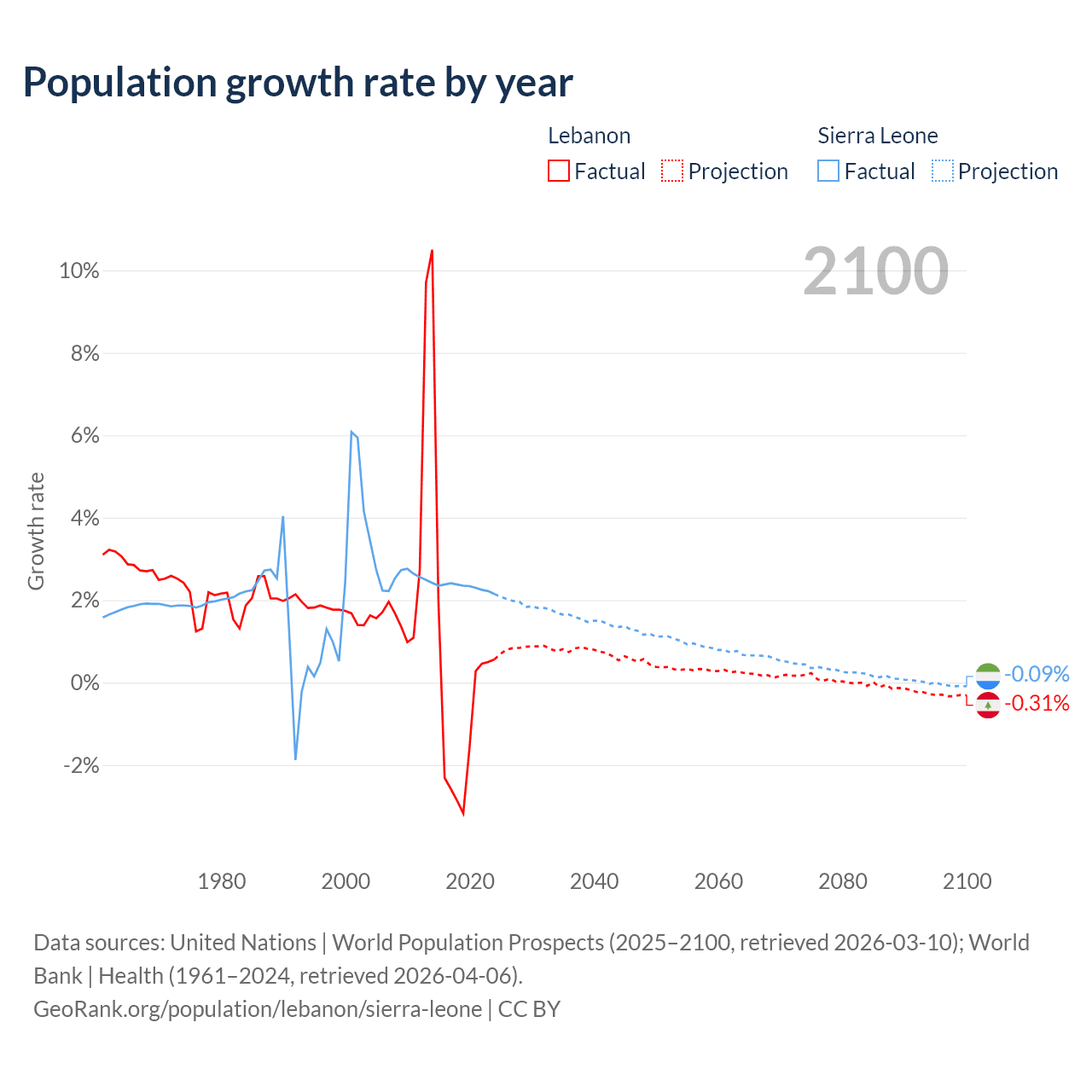 - For the last 10 years, Lebanon has had an average growth rate of +0.16% per year vs +2.32% in Sierra Leone.
