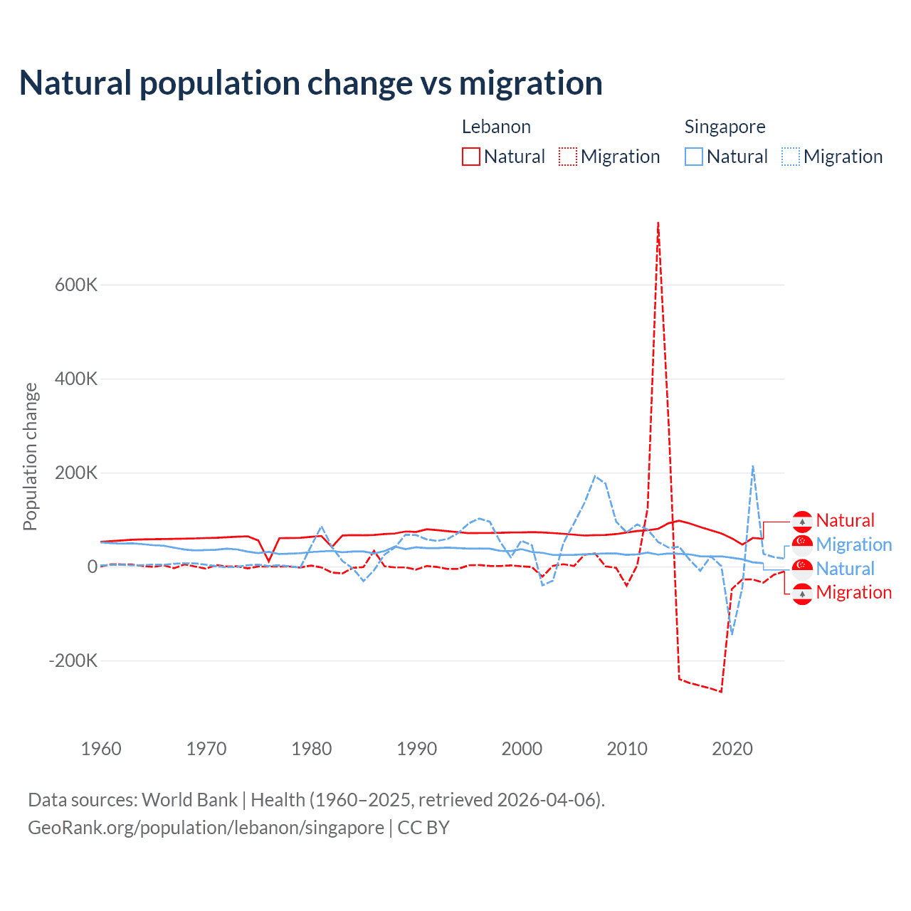 Over the last 10 years, 40.1% of the population change in Lebanon is from natural causes (a gain of 739,256 people) and 59.9% is from migration (a loss of 1,103,772 people). In Singapore 54.8% is from natural causes (a gain of 195,953 people) and 45.2% is from migration (a gain of 161,805 people).