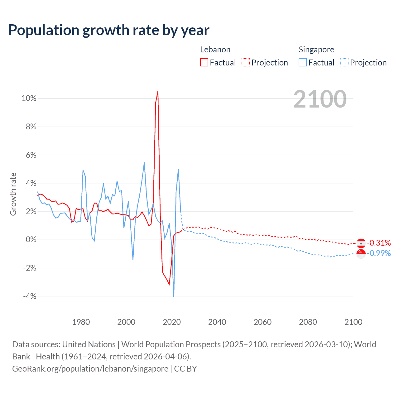 - For the last 10 years, Lebanon has had an average growth rate of +0.16% per year vs +1.04% in Singapore.