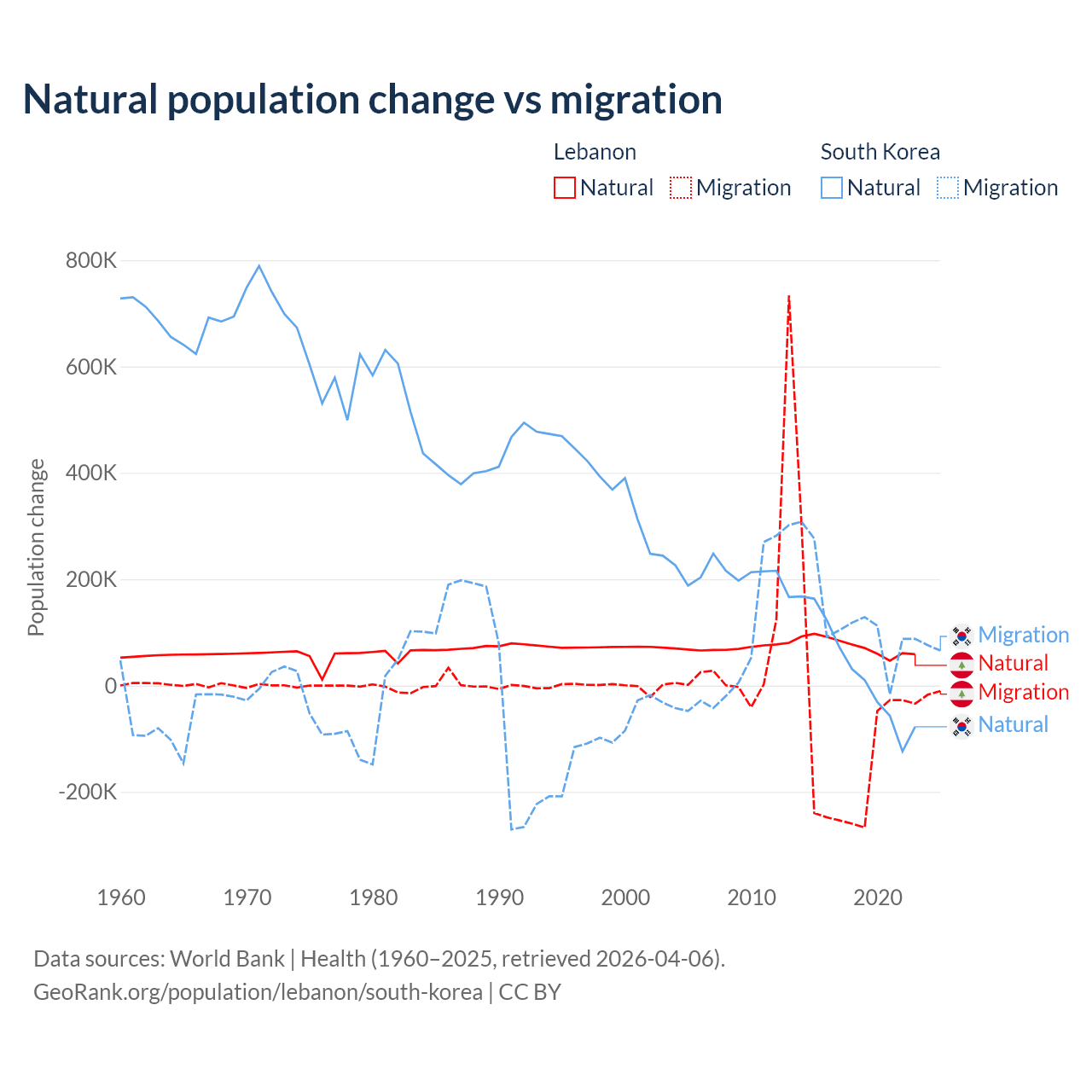 Over the last 10 years, 40.1% of the population change in Lebanon is from natural causes (a gain of 739,256 people) and 59.9% is from migration (a loss of 1,103,772 people). In South Korea 17.6% is from natural causes (a gain of 277,215 people) and 82.4% is from migration (a gain of 1,298,356 people).