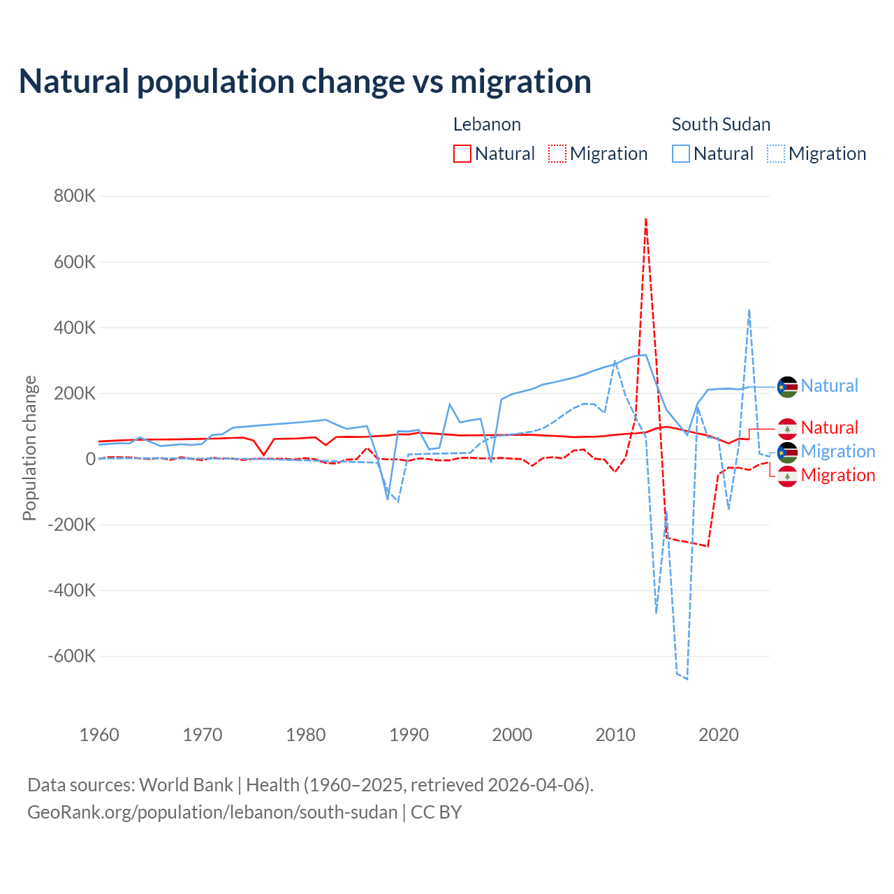 Over the last 10 years, 40.1% of the population change in Lebanon is from natural causes (a gain of 739,256 people) and 59.9% is from migration (a loss of 1,103,772 people). In South Sudan 57.4% is from natural causes (a gain of 1,792,135 people) and 42.6% is from migration (a loss of 1,329,606 people).