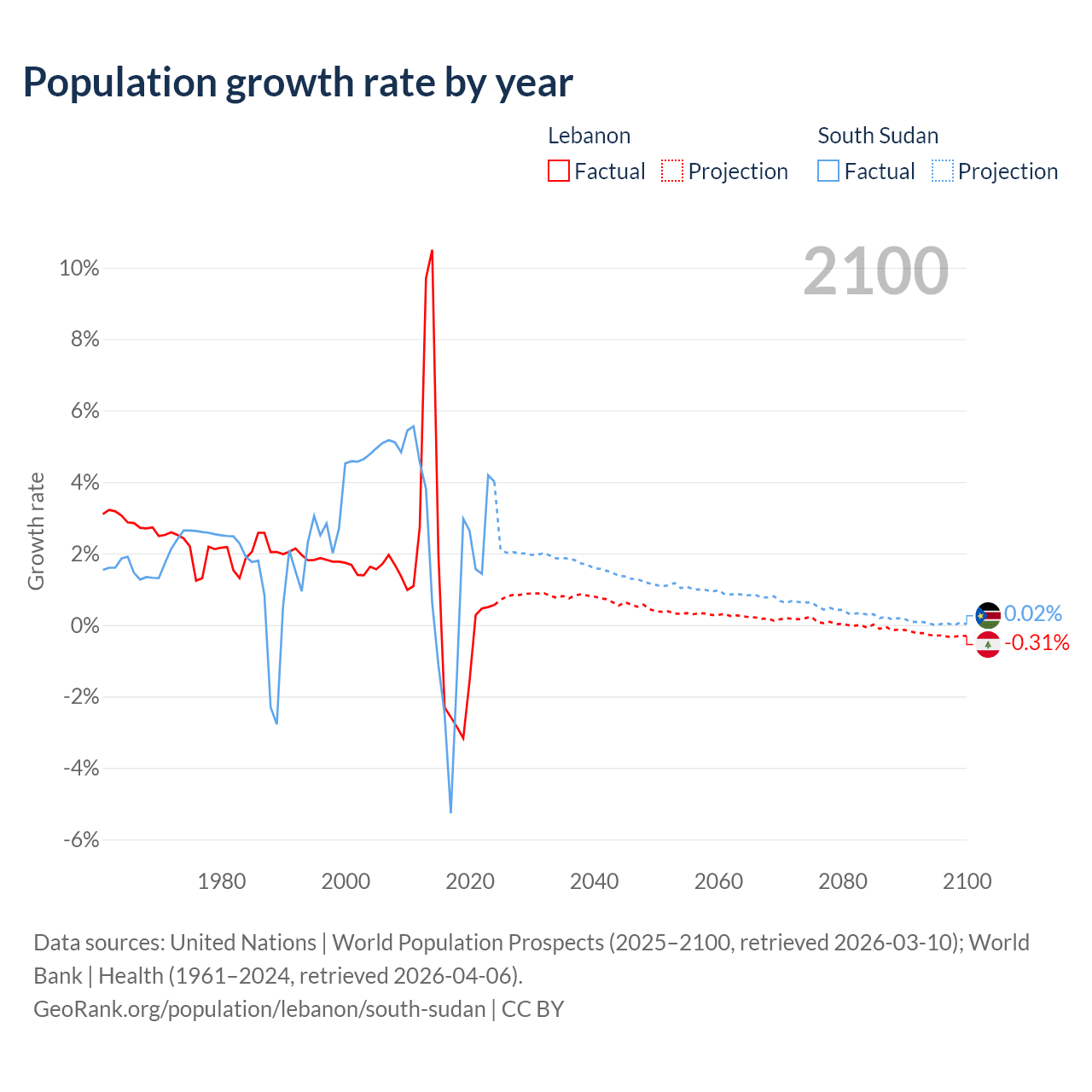 - For the last 10 years, Lebanon has had an average growth rate of +0.16% per year vs +0.65% in South Sudan.
