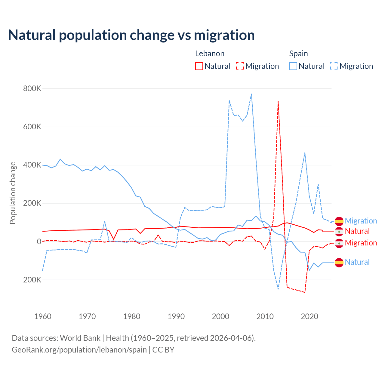 Over the last 10 years, 40.1% of the population change in Lebanon is from natural causes (a gain of 739,256 people) and 59.9% is from migration (a loss of 1,103,772 people). In Spain 25.8% is from natural causes (a loss of 627,829 people) and 74.2% is from migration (a gain of 1,810,127 people).