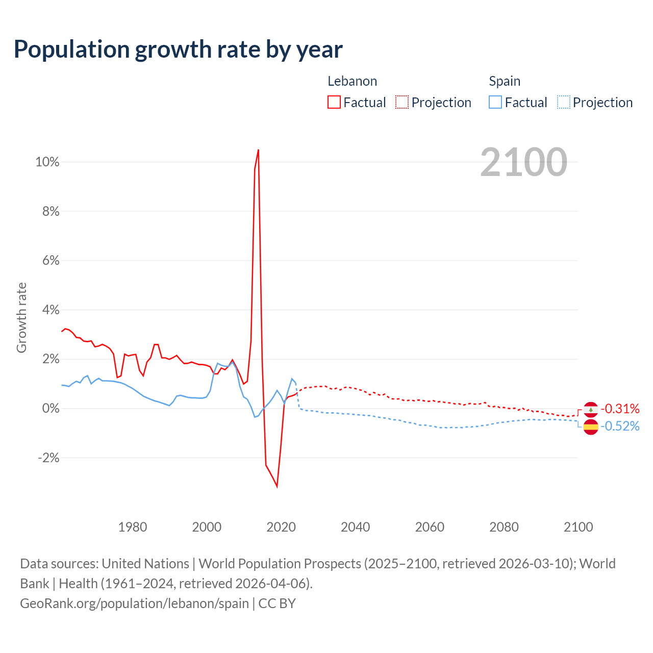 - For the last 10 years, Lebanon has had an average growth rate of +0.16% per year vs +0.43% in Spain.