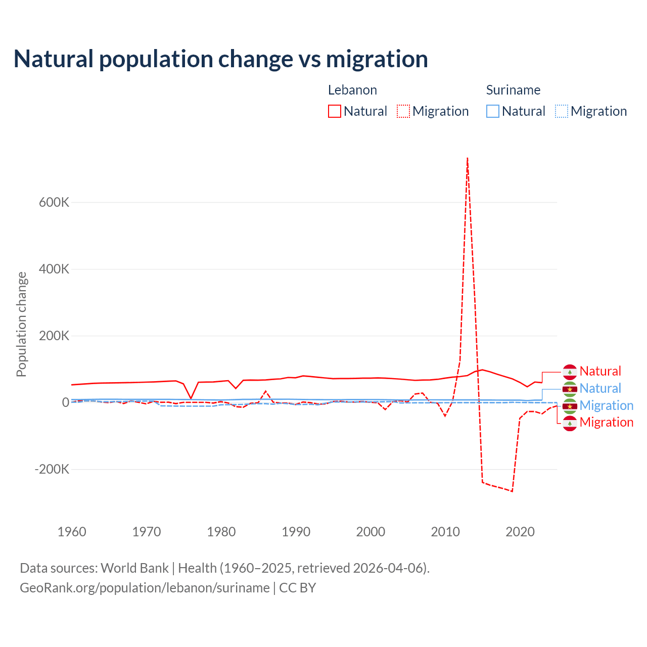 Over the last 10 years, 40.1% of the population change in Lebanon is from natural causes (a gain of 739,256 people) and 59.9% is from migration (a loss of 1,103,772 people). In Suriname 90.3% is from natural causes (a gain of 66,709 people) and 9.72% is from migration (a loss of 7,185 people).