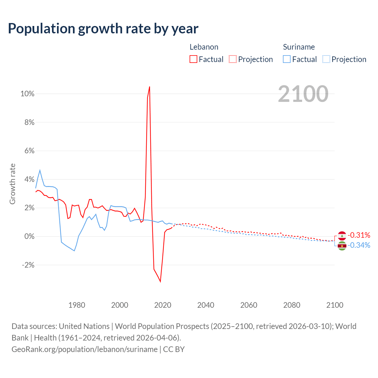 - For the last 10 years, Lebanon has had an average growth rate of +0.16% per year vs +0.99% in Suriname.