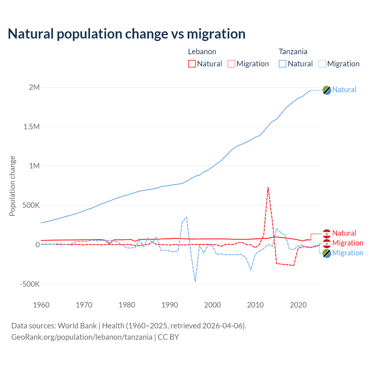 Over the last 10 years, 40.1% of the population change in Lebanon is from natural causes (a gain of 739,256 people) and 59.9% is from migration (a loss of 1,103,772 people). In Tanzania 98.7% is from natural causes (a gain of 17,769,541 people) and 1.27% is from migration (a gain of 229,466 people).