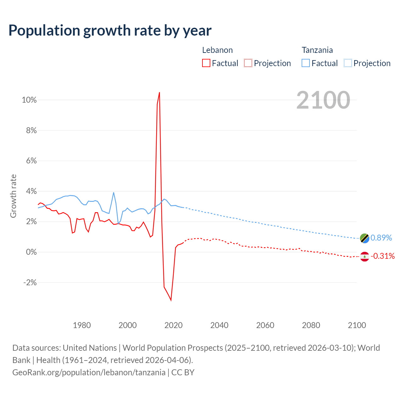 - For the last 10 years, Lebanon has had an average growth rate of +0.16% per year vs +3.13% in Tanzania.