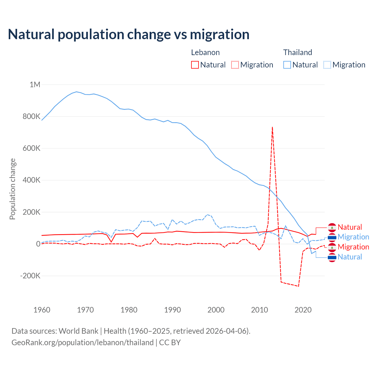 Over the last 10 years, 40.1% of the population change in Lebanon is from natural causes (a gain of 739,256 people) and 59.9% is from migration (a loss of 1,103,772 people). In Thailand 78.4% is from natural causes (a gain of 1,292,528 people) and 21.6% is from migration (a gain of 355,361 people).
