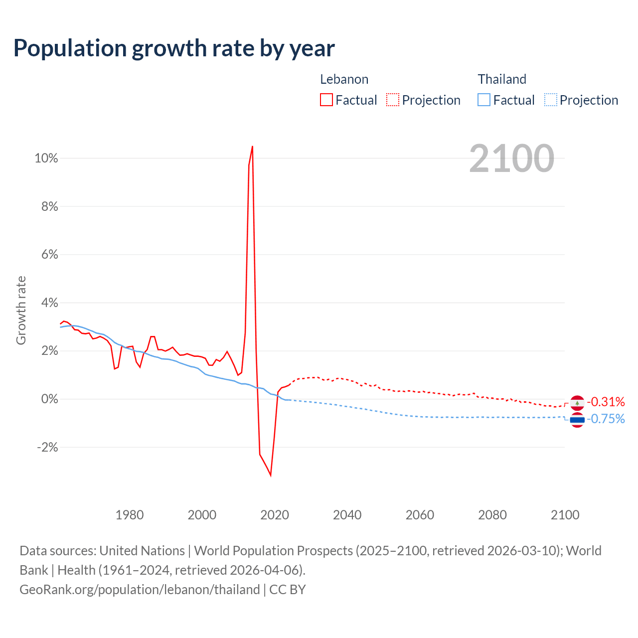 - For the last 10 years, Lebanon has had an average growth rate of +0.16% per year vs +0.23% in Thailand.