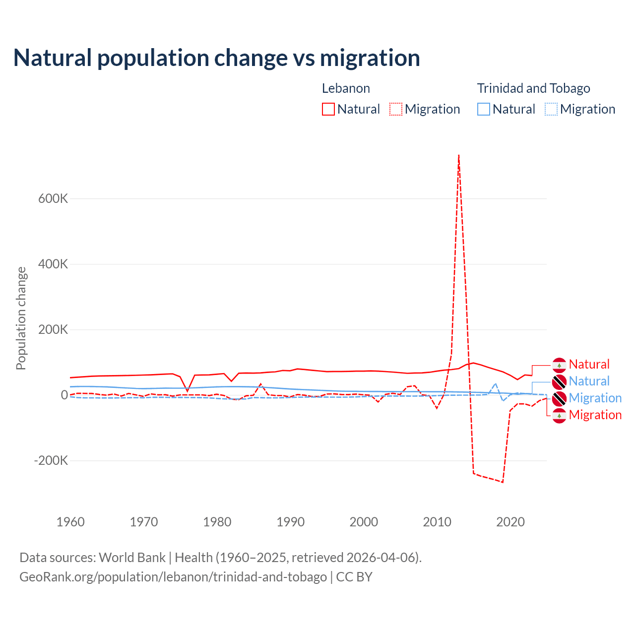 Over the last 10 years, 40.1% of the population change in Lebanon is from natural causes (a gain of 739,256 people) and 59.9% is from migration (a loss of 1,103,772 people). In Trinidad and Tobago 66% is from natural causes (a gain of 55,887 people) and 34% is from migration (a gain of 28,785 people).
