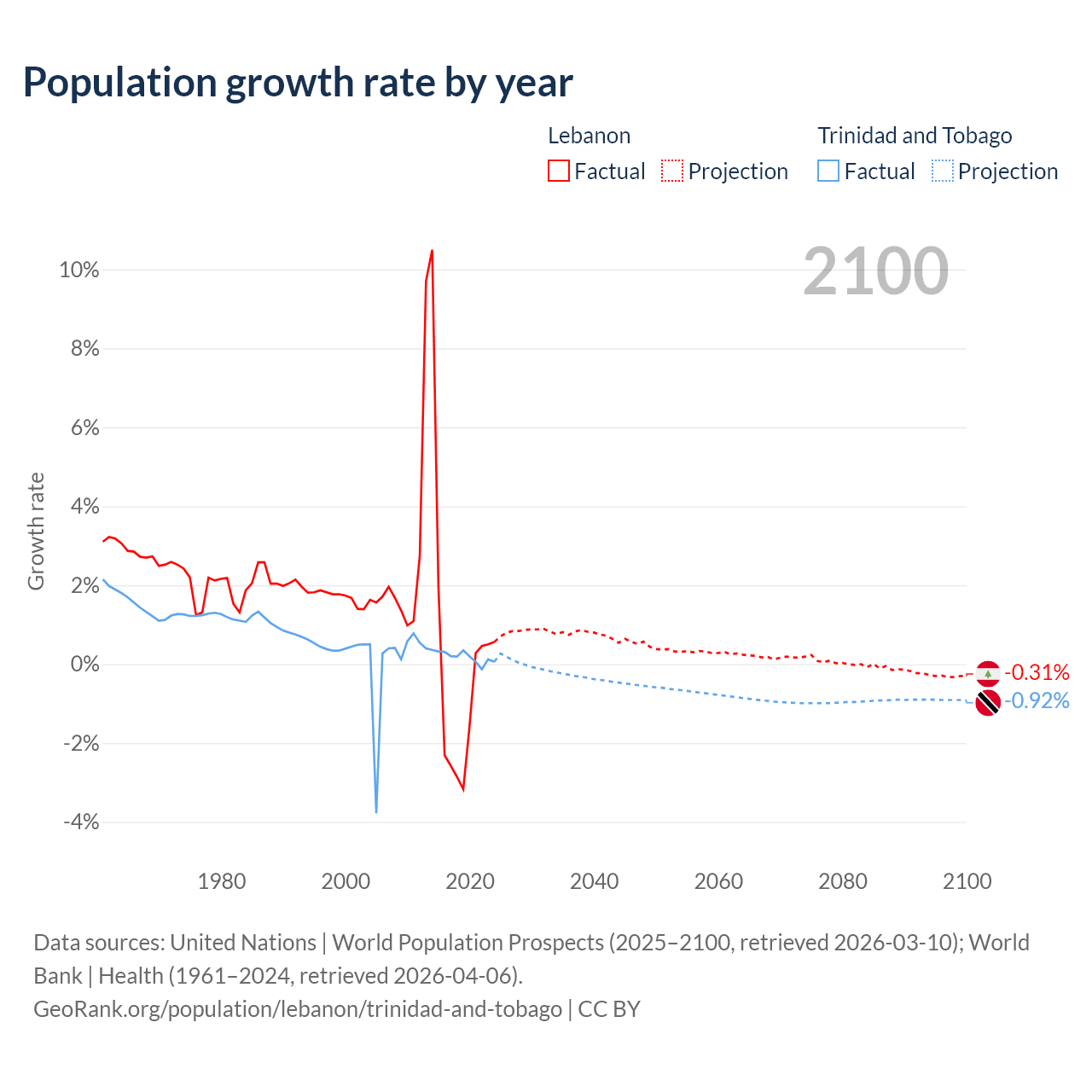 - For the last 10 years, Lebanon has had an average growth rate of +0.16% per year vs +0.19% in Trinidad and Tobago.