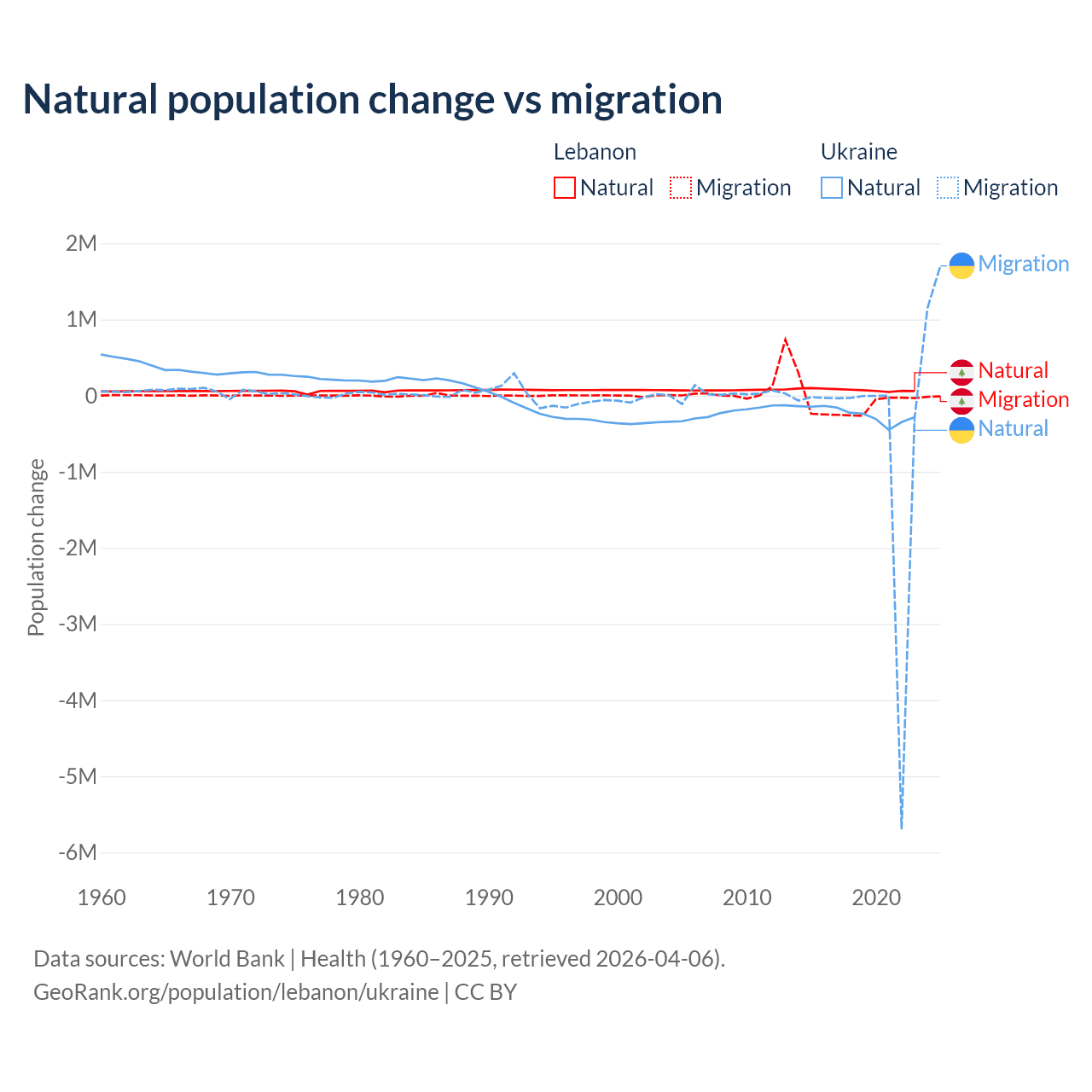 Over the last 10 years, 40.1% of the population change in Lebanon is from natural causes (a gain of 739,256 people) and 59.9% is from migration (a loss of 1,103,772 people). In Ukraine 28.2% is from natural causes (a loss of 2,435,153 people) and 71.8% is from migration (a loss of 6,198,995 people).