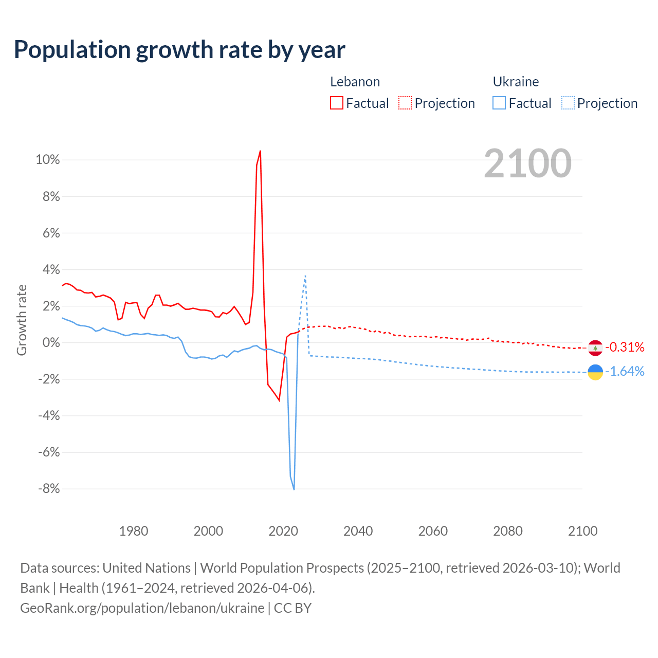 - For the last 10 years, Lebanon has had an average growth rate of +0.16% per year vs -1.74% in Ukraine.