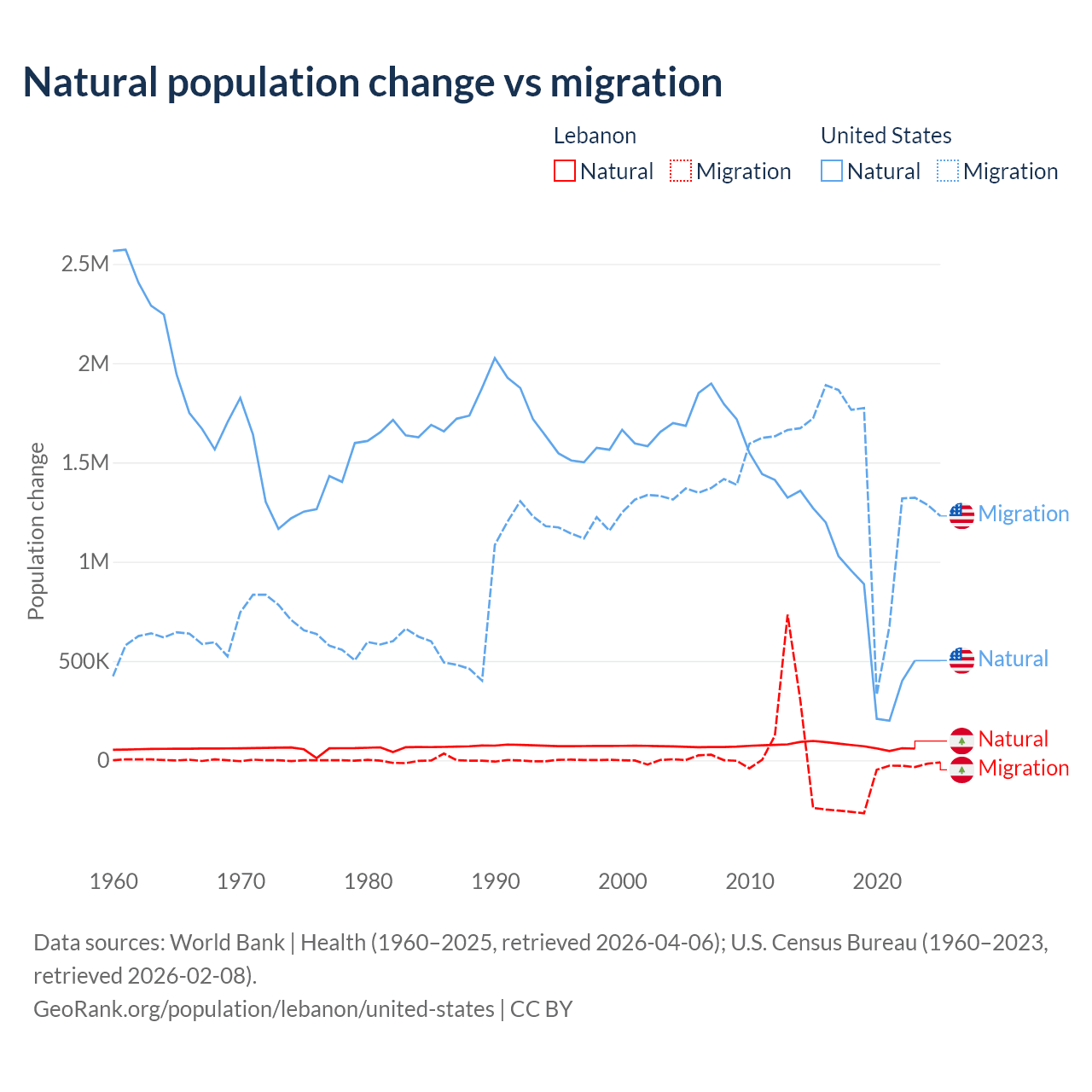 Over the last 10 years, 40.1% of the population change in Lebanon is from natural causes (a gain of 739,256 people) and 59.9% is from migration (a loss of 1,103,772 people). In the United States 35.8% is from natural causes (a gain of 8,005,866 people) and 64.2% is from migration (a gain of 14,334,286 people).
