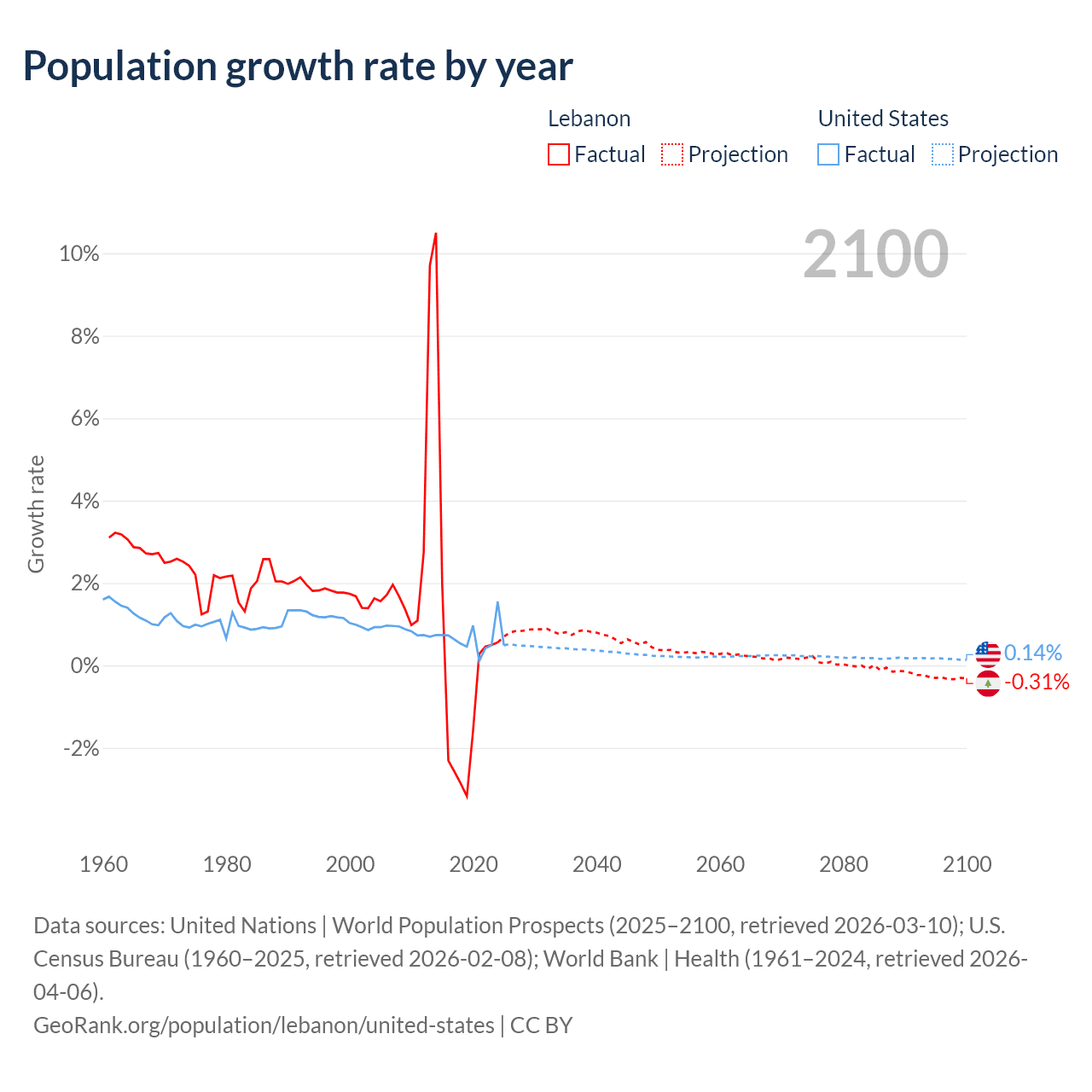- For the last 10 years, Lebanon has had an average growth rate of +0.16% per year vs +0.65% in the United States.