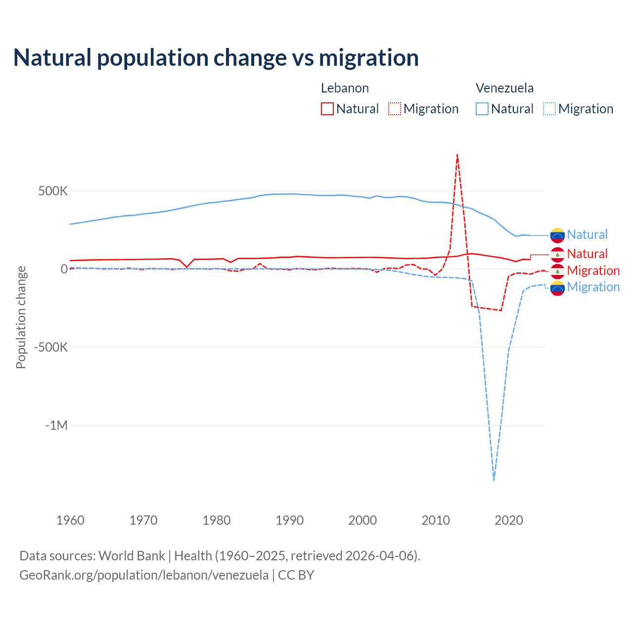Over the last 10 years, 40.1% of the population change in Lebanon is from natural causes (a gain of 739,256 people) and 59.9% is from migration (a loss of 1,103,772 people). In Venezuela 38.6% is from natural causes (a gain of 2,946,257 people) and 61.4% is from migration (a loss of 4,683,227 people).