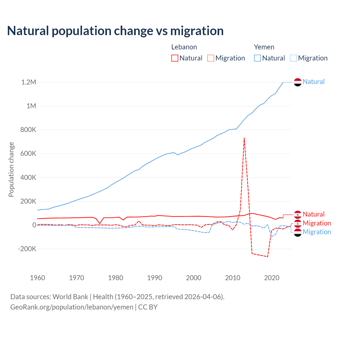 Over the last 10 years, 40.1% of the population change in Lebanon is from natural causes (a gain of 739,256 people) and 59.9% is from migration (a loss of 1,103,772 people). In Yemen 97.8% is from natural causes (a gain of 10,460,813 people) and 2.17% is from migration (a loss of 231,814 people).
