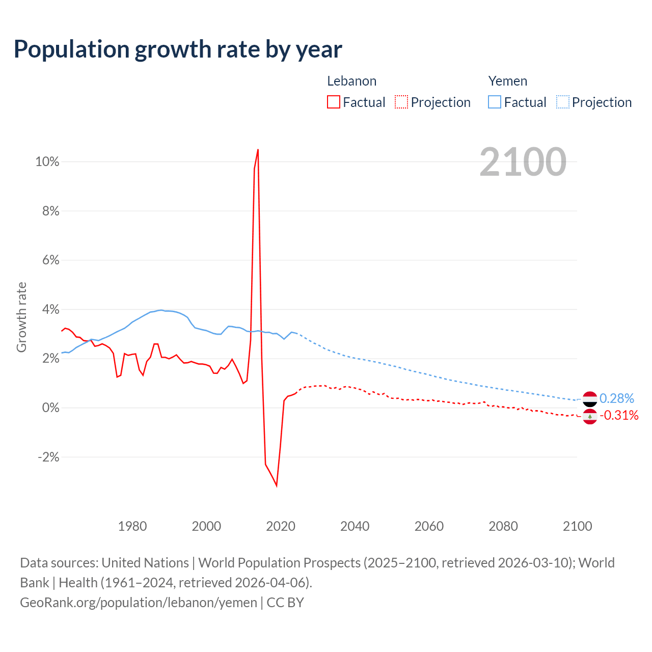 - For the last 10 years, Lebanon has had an average growth rate of +0.16% per year vs +3% in Yemen.