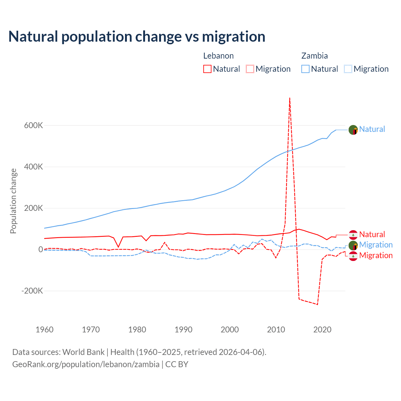 Over the last 10 years, 40.1% of the population change in Lebanon is from natural causes (a gain of 739,256 people) and 59.9% is from migration (a loss of 1,103,772 people). In Zambia 97.4% is from natural causes (a gain of 5,233,797 people) and 2.58% is from migration (a gain of 138,554 people).