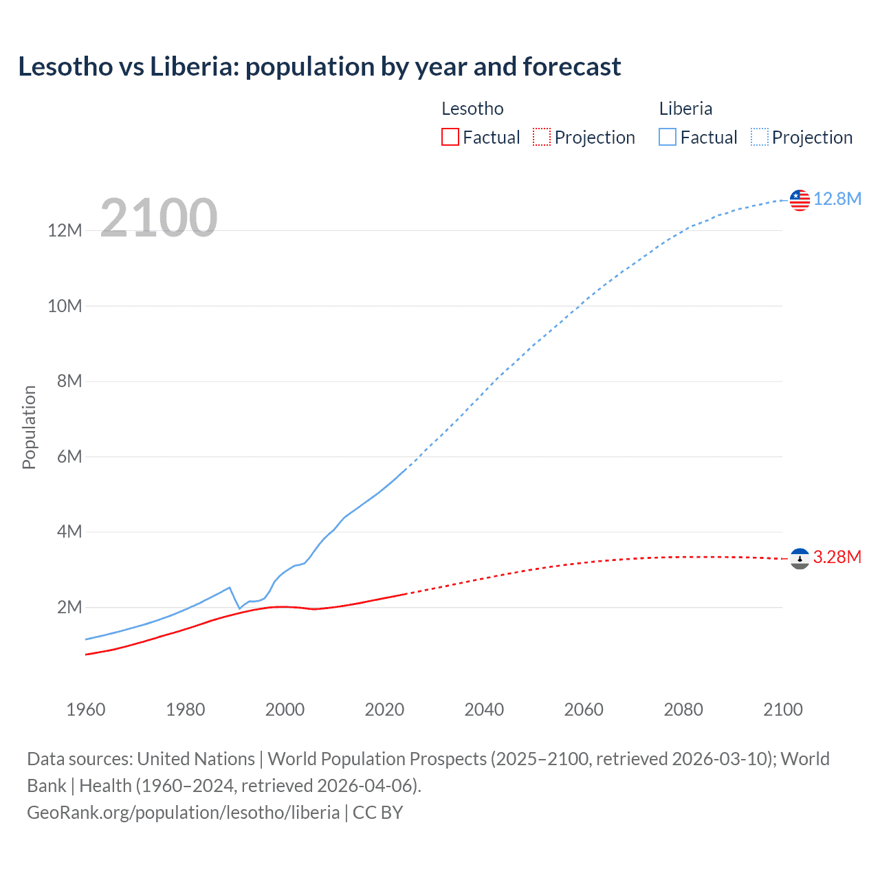 Lesotho vs Liberia: population by year and forecast