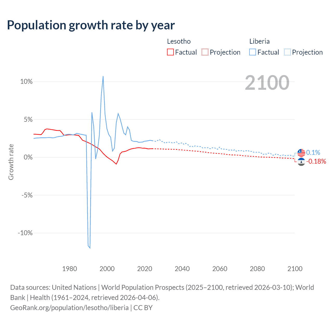 - For the last 10 years, Lesotho has had an average growth rate of +1.17% per year vs +2.09% in Liberia.