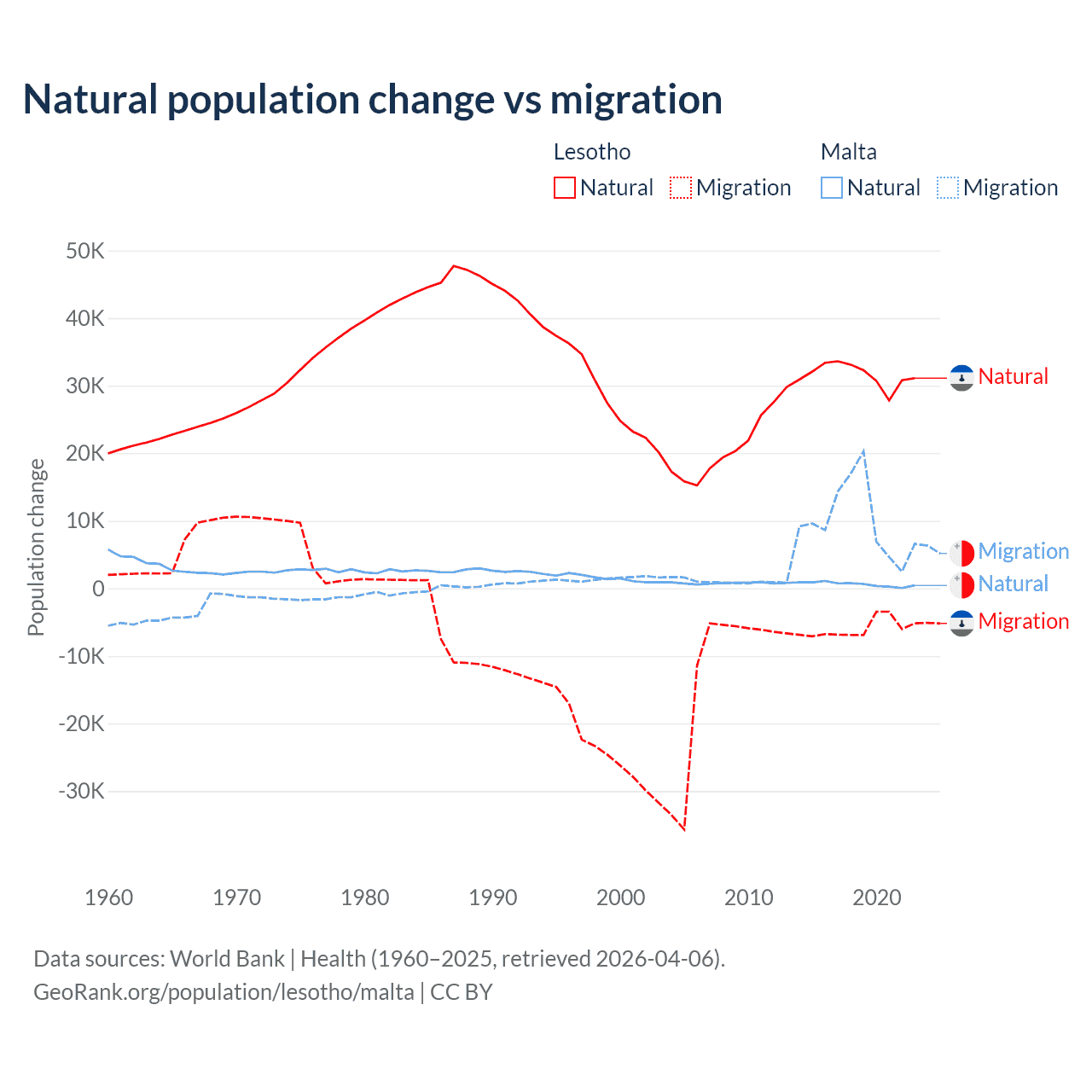 Over the last 10 years, 84.2% of the population change in Lesotho is from natural causes (a gain of 315,836 people) and 15.8% is from migration (a loss of 59,457 people). In Malta 5.84% is from natural causes (a gain of 6,181 people) and 94.2% is from migration (a gain of 99,652 people).