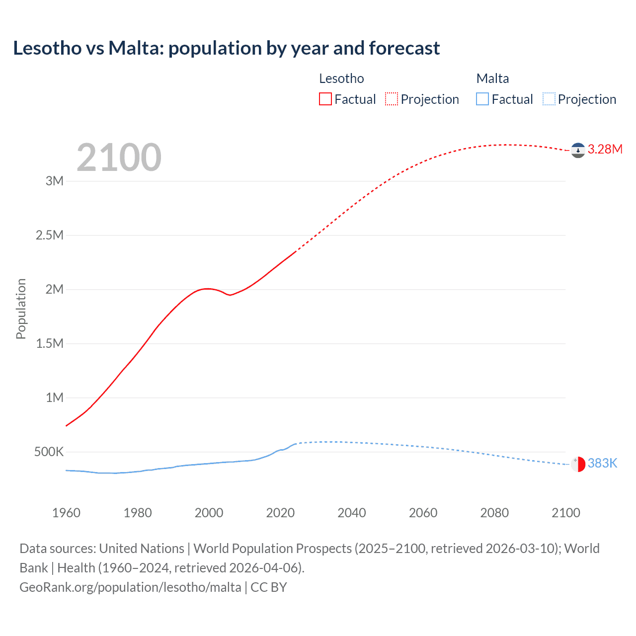 Lesotho vs Malta: population by year and forecast